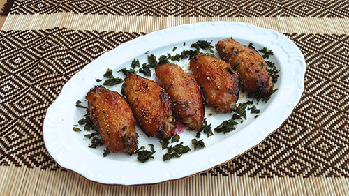 1. 如果不想用油煎方法,也可放入已預熱的烤箱(攝氏220度),把雞翼(皮朝下)烤20分鐘,再翻面烤20分鐘後,掃上蜜糖多烤10分鐘,上碟後灑上七味粉
