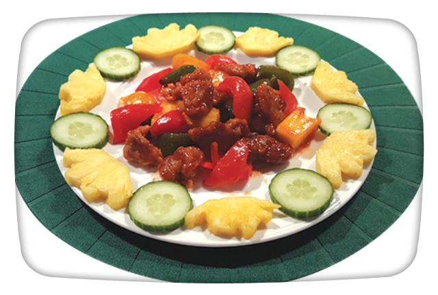 6. 倒去炒鍋裡的炸油,將紅椒、黃椒、青椒略炒,加入調味料拌勻後放入菠蘿及豬肉粒,豬肉粒蘸滿調味汁料後便可上碟享用