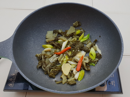 3. 用1湯匙生油起鑊,炒香蒜片、大蒜和辣椒,放入鹹酸菜和白菜略炒