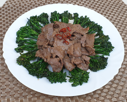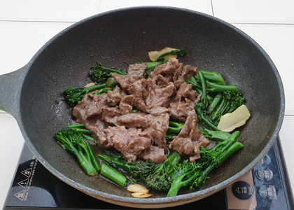 6. 鑊內放1湯匙生油,加入蒜片和薑爆香,放入芥蘭炒熟後加入調味料和牛肉,炒勻便可上碟享用