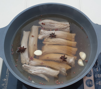 2. 鍋內放入熱水煮滾後,加入已出水的羊排、花椒、八角、蒜頭和調味料,用中小火煮約30分鐘後盛起隔水備用