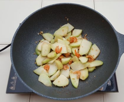 3. 熱鍋後放入2湯匙生油爆香蒜粒,放入蝦米略炒後再放入合掌瓜片及調味料,然後放入粉絲,轉慢火煮至汁液收乾,便可上碟享用