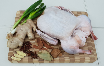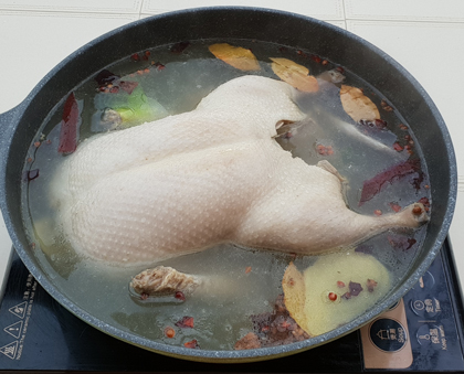 2. 燒一鍋熱水,放入薑、蔥、紹酒及配料煮滾後放入全鴨,將火調至小火蓋上鍋蓋慢煮,其間約20分鐘反動鴨身上下一次,使鴨均勻上色及煮至入味,收至濃汁後盛起隔去水分,放涼後斬件上碟享用