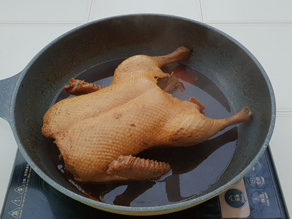3. 如覺得鴨已全熟及已入味,剩下汁液太多,可盛起鴨後繼續煮至汁液濃縮,待鴨放涼後斬件淋上汁液,或將汁液盛入小碟中伴鴨食用