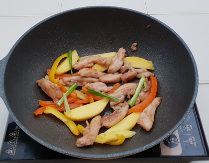 3. 用1湯匙生油起鑊,將雞柳放入炒至八成熟,加入黃、橙椒略炒,再放入芒果後加入調味料炒至均勻,最後放入腰果和葱段略炒便可上碟享用