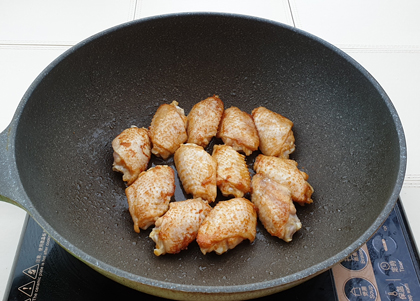 2. 用2湯匙生油起鑊,用中火煎香雞翼兩面至金黃色,盛起備用