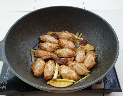 3. 鑊內加入1湯匙生油,爆香薑、葱後放入冰糖及調味料,再加入雞翼煮至汁液濃稠後,盛起上碟享用