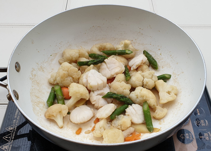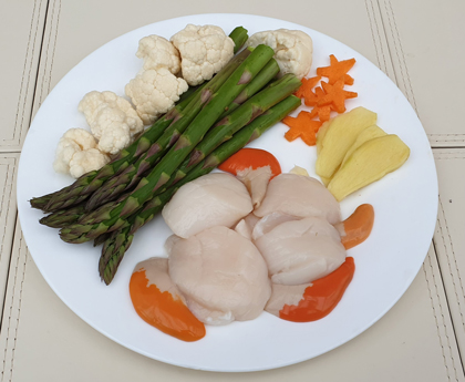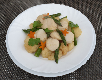 3. 鑊內放2湯匙生油,放入薑片、椰菜花、蘆筍、甘筍,加入調味料,煮滾後加入帶子略炒,生粉水拌勻後埋芡收汁,灑上少許麻油,便可上碟享用