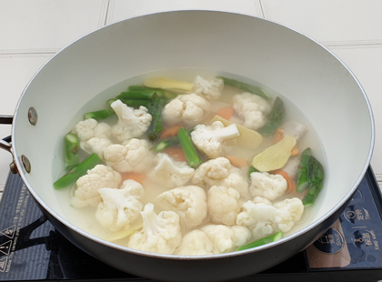 2. 蘆筍切段,椰菜花切段,用鑊將水澆煮,先放入椰菜花,再放蘆筍及甘筍略為煮熟後隔水備用